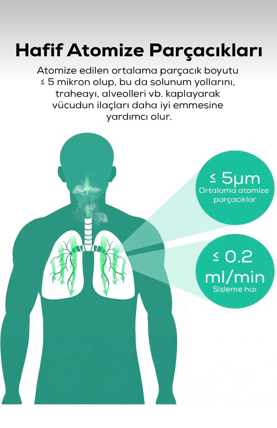 Solunex nebülizatör, solunum yolu rahatsızlıklarında ilacın direkt akciğerlere ulaşmasını sağlayan pratik bir cihazdır. Taşınabilir yapısı sayesinde evde, işte veya seyahatte kolayca kullanılabilir. Nefes darlığı, öksürük ve tıkanıklık gibi durumlarda hızlı rahatlama sunar.”